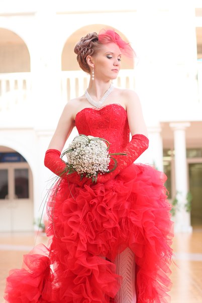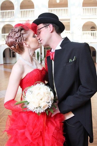 Свадьба у нас была в ретро стиле. Красный — мой любимый цвет, его сложно не заметить, и он идеально подошел под выбранный образ. Платье шили на заказ, потому что в магазинах ничего подобного не нашлось».